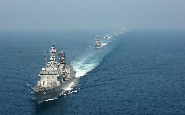 바다에선 남과 북이 조우하는 일이 심심치 않게 일어난다. 2013년 6월 동해 해상에서 진행된 해군 해상기동훈련 모습. 맨 앞이 광개토대왕함이고 두 번째가 부산함이다. 한겨레