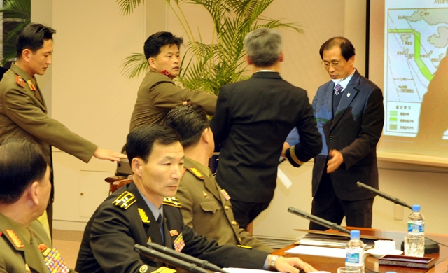 2007년 12월13일 오전 판문점 남쪽 ‘평화의집’에서 열린 제7차 남북 장성급 군사회담에서 현역 군인 시절의 김동엽 교수(가운데 등 보이는 이)가 북한의 일방적 주장이 담긴 공동어로구역 도면이 공개되지 않게 하기 위해 북한 군인과 몸싸움을 벌이고 있다. 사진공동취재단