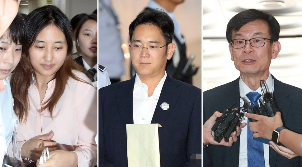 이재용 삼성전자 부회장의 재판에 7월12일 증인으로 출석한 정유라씨(왼쪽). 7월14일 서울중앙지법 법정을 향하는 이재용 부회장(가운데)과 증인으로 출석한 김상조 공정거래위원장(오른쪽). 연합뉴스