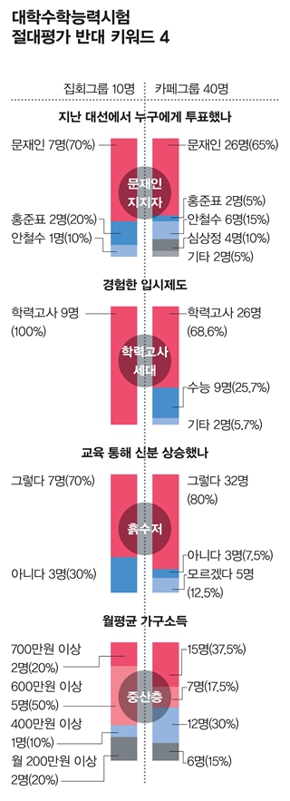 조사 결과를 종합하면, 수능 절대평가에 반대하는 이들을 설명하는 키워드는 △문빠 △학력고사 세대 △흙수저 △중산층 등 4가지로 요약된다. 설문에 응답한 학부모들이 자발적으로 자신이 속한 ‘단톡방’(단체 카카오톡 대화방)과 ‘밴드모임’(네이버 밴드) 등에 설문조사 주소를 뿌려 40명이 응답한 결과도 크게 다르지 않다(표 참조). 다시 말해 수능 절대평가에 반대하는 이들은 1960년대 후반~1970년대 초반 중산층 이하 가정에서 태어나 고액 과외 등 사교육 없이 교과서로만 공부해 학력고사로 대학에 입학한 세대다. 이들은 비교적 진보 정치인을 지지하며 살아왔다. 교육 전문가들이 아무리 학력고사와 수능 같은 객관식 상대평가에 대한 부정적 담론을 만들어도, 상대평가 체제에서 과실을 획득해온 학부모들은 상대평가의 긍정적 담론을 무한 생산할 준비가 돼 있는 상황이다.