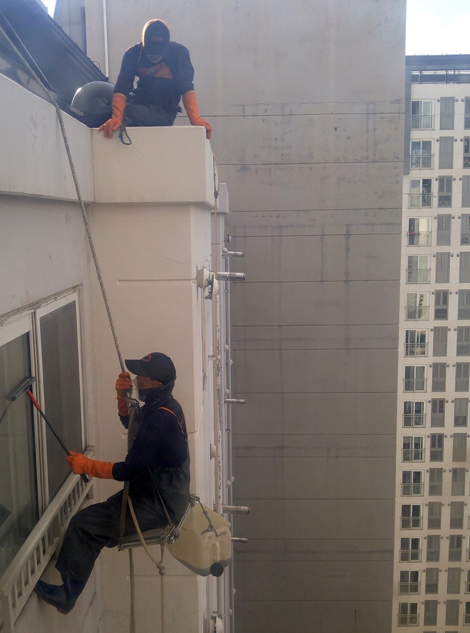 “오늘은 줄 타야지.” 3일차, 기창 형님과 함께 로프를 탔다. 청소 도구 말고 일단 몸만 작업대에 실었다. 장비를 챙기던 중 샤클에 브레이크가 없다는 사실을 발견했다. 브레이크는 샤클에 붙은 작은 걸고리다. 로프를 타고 내려가다 작업 위치에서 로프를 브레이크에 걸면 고정된다. “꽉 잡고 있으면 문제없어. 로프를 한 바퀴 돌려서 샤클에 얹으면 돼.” 그렇게 첫 ‘줄타기’가 시작됐다. 고소공포증보다 이틀 동안 안전교육을 받지 못했다는 생각에 불안했다. 걱정한 것보다 로프는 안정적이었고, 로프에 매달려 있는 것은 기술보다 용기가 필요한 일이었다. “별거 없지?” 성민이 말했다. 모두 내가 자질이 있다고 입을 모았다. 기창 형님은 “난 처음부터 건물 끝에서 줄 탔어. 바로 옆이 한강이었다고. 이 아파트는 아무것도 아니야”라고 말했다. 준호 형님은 “난 처음에 줄 타면서 작업도 같이 했다”고 말했다. 로프를 처음 타는 과정에서 제대로 교육받은 이는 없어 보였다. 로프공은 전문직이라 말하던 사장의 얼굴이 떠올랐다.
