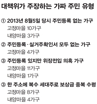 그런데 소송 과정에서 흥미로운 사실이 발견됐다. 내양마을·고정마을 반대 주민들과 대책위가 2014년 이뤄진 합의가 ‘유령 합의’라는 의혹을 제기한 것이다. 이들은 그동안 입수한 자료를 토대로 내양마을 7가구, 고정마을 21가구가 당시 보상금 지급 조건에 해당하지 않는 가짜 주민이라는 주장을 내놓았다. 2014년 합의가 이뤄질 때도 위장전입으로 마을에 주소지를 옮긴 ‘가짜 주민’을 둘러싼 의혹이 제기된 바 있으나, 한 마을의 전체 가구를 대상으로 적격 여부를 따져본 것은 이번이 처음이다.