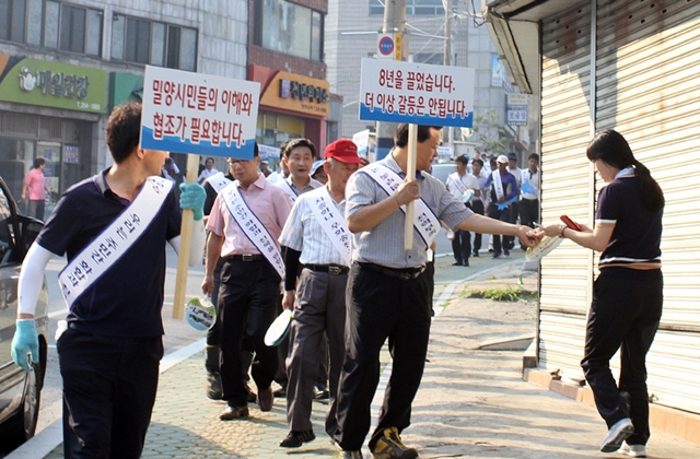 2013년 8월 밀양 시내에서 한국전력과 송전탑 시공사 직원 등이 ‘밀양시민의 이해와 협조가 필요하다’고 쓴 손팻말을 들고 거리행진을 하고 있다. 연합뉴스