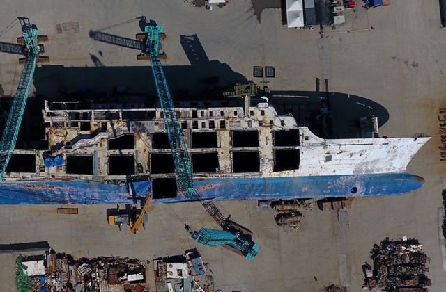 미수습자 9명 중 5명은 뼛조각도 수습하지 못한 채 세월호 선체 수습 작업이 9월 말 끝난다. 9월14일 오후 전남 목포신항에서 수색 작업을 위해 선체 오른쪽을 사각형 모양으로 절단한 세월호와 그곳에서 나온 화물들을 무인항공기를 이용해 촬영했다. 김봉규 기자