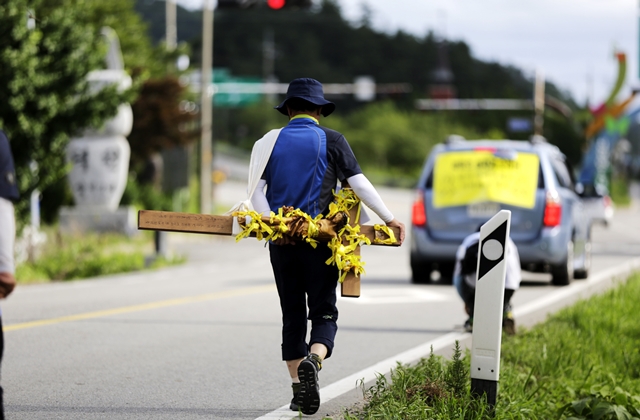 2014년 경기도 안산 단원고 고 김웅기 학생의 아버지 김학일씨가 십자가를 짊어지고 전남 함평군 신광면을 걷고 있다. <한겨레21>은 세월호 유가족 도보 순례단과 38일간 함께 길을 걸으며 페이스북으로 현장 중계했다.