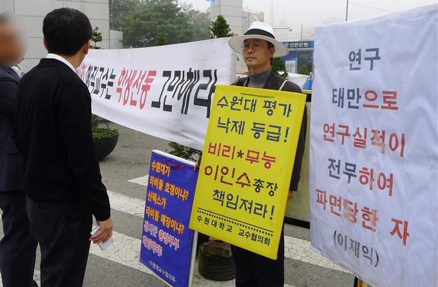 수원대 해직 교수인 이재익(건축공학과) 교수 등은 2014∼2015년 수원대 정문 앞 집회 과정에서 교직원 김씨 등이 ‘연구 태만으로 연구 실적이 전무하여 파면당한 자(이재익)’라고 쓴 팻말을 들고 집회를 방해하며 명예를 훼손했다고 고소했다. 또 “X새끼, XX놈”은 물론 “XX, 확 그냥 모가지를 따 버릴까” 라고 욕한 이들 교직원을 모욕 혐의로 고소했다.