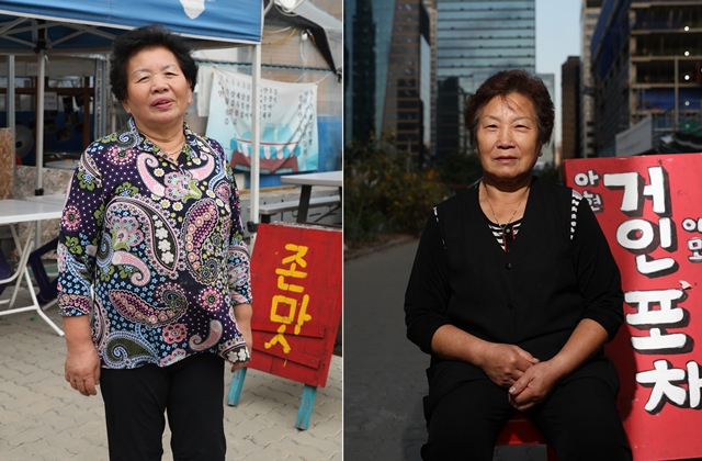 지난해 8월 강제 철거된 뒤 서울 공덕역 경의선 공유지에서 새롭게 ‘아현포차’를 연 ‘강타 이모’(왼쪽)와 ‘작은거인’ 이모. 경의선 공유지에선 도시에서 떠밀려난 ‘도시 난민’들이 연대하며 삶을 꾸리고 있다.