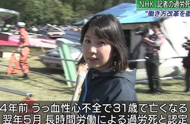 기자가 한 달 동안 159시간 넘는 잔업(연장근로)에 시달린 끝에 과로사한 사실이 드러났다. 는 10월4일 밤 ‘9시 뉴스’를 통해 2013년 7월 당시 31살이던 사도 미와 기자가 울혈성심부전으로 숨졌고, 이듬해 산업재해 판정을 받았다고 발표했다. 사도 기자는 숨지기 전 한 달 동안 159시간 동안 잔업을 했고, 주말에도 쉰 날은 이틀뿐이었다. 자정을 넘겨 일한 날도 15일이었다. 159시간 잔업을 한 달 이전 달에도 146시간 잔업을 했다. 일본 정부가 정한 과로사 위험 잔업 시간인 ‘한 달 동안 100시간 또는 2~6개월 동안 평균 80시간 이상’을 크게 뛰어넘는 장시간 노동이었다.