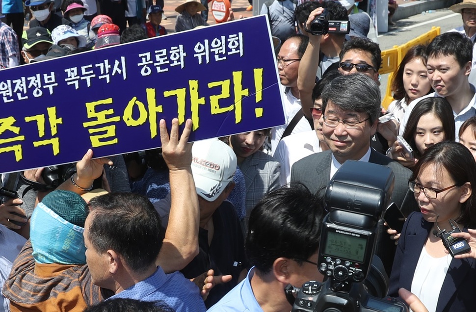 김지형 신고리 5·6호기 공론화위원회 위원장(가운데)이 8월28일 울산시 울주군 서생면 한국수력원자력 새울원자력본부를 방문했다가 공사 재개를 주장하는 지역 주민들에게 막혀 어색한 표정을 짓고 있다. 결국 김 위원장은 방문을 포기하고 발길을 돌려야 했다. 연합뉴스