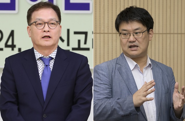 강재열 ‘한국원자력산업회의’ 상근부회장(왼쪽)과 이헌석 ‘안전한 세상을 위한 신고리 5·6호기 백지화 시민행동’ 대응팀장 연합뉴스/한겨레