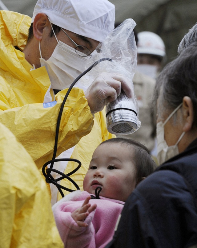 핵사고가 발생한 후쿠시마 제1원전에서 서쪽으로 40km 떨어진 후쿠시마현 니혼마쓰시에서 한 아기가 방사능 피폭 검사를 받고 있다. REUTERS 연합뉴스