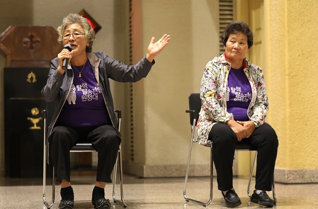 9월21일 서울 은평구 불광동 성당에서 열린 ‘탈핵·탈송전탑 토크콘서트’에 참석 한 한옥순씨(왼쪽)와 박후복씨. 한씨는 토크콘서트 발언은 미리 준비하지 않는다며 “누가 자꾸 잘해라, 어떻게 해라 시키면 아무것도 말이 안 된다. 가만 놔두면 그대로, 내가 겪은 그대로 말을 할 수 있다”고 했다.