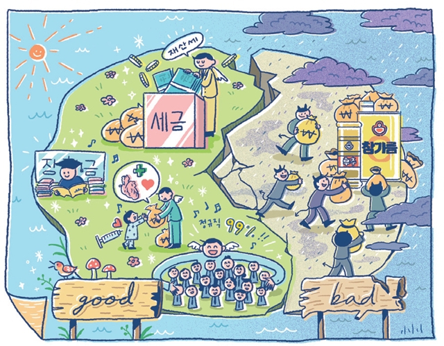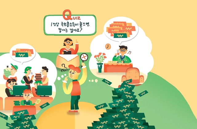 이 이야기는 150년 전에 나왔지만, 맥초우컴차일드 선생과 같은 생각은 요즘도 쉽게 볼 수 있어요. ‘1인당 국민총소득’이란 말 들어봤나요? 영어로는 ‘1인당 지엔피(GNP)’라고 해요. 좀 어렵지요? 중·고등학교에 가면 배울 내용이지만, 주위에서 워낙 많이 쓰는 말이라 동무들도 한 번쯤 들어봤을 거예요. 쉽게 말하면, 한국 사람 전체가 1년 동안 번 돈을 말해요. 1인당 국민총소득은 그 돈을 인구수만큼 나눈 거고요. 한국 1인당 국민총소득이 미국 돈으로 2만7천달러쯤 된다고 해요. 한국보다 잘사는 나라라고 하는 미국은 5만7천달러, 일본은 3만8천달러 정도 하죠. 그래서 흔히 사람들은 한국이 일본보다 1만달러 정도 뒤처진다고 생각해요. 한국도 빨리 일본처럼 1인당 국민총소득이 3만달러가 돼야 한다고 말하죠. 그러면 한국이 지금보다 더 부자 나라가 되고, 사람들도 전보다 더 부자가 된다고 생각해요.