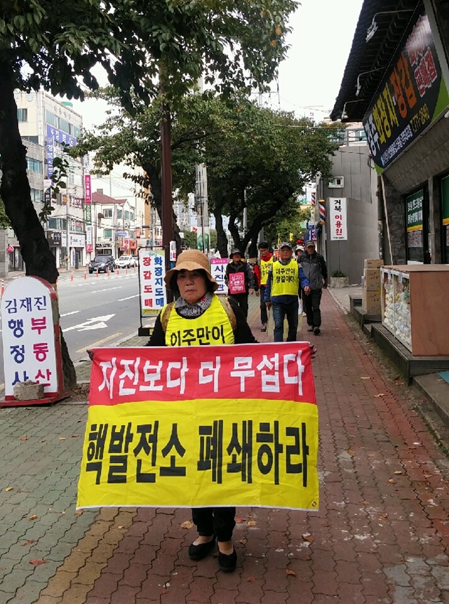 매주 목요일 오전 10시, 경북 경주 월성핵발전소 최인접 마을인 양남면 나아리이주대책위원회 주민들은 경주 시내를 걷는 ‘탈핵 도보 순례’를 했다. 신고리 5·6호기 공론화위원회의 결과 발표 하루 전날인 10월19일에도 황분희 나아리이주대책위원회 부위원장과 신용화 사무국장, 이상홍 경주 환경운동연합 사무국장 등은 경주 시내를 4시간여 걸었다. 신 국장은 신고리 5·6호기 건설 재개 쪽으로 결론이 날 거라고 예감했다. “우리나라 사람들이 아직은 매몰 비용 2조원에 더 흔들리지 않을까 걱정이죠. 월성원전 1호기 수명 연장 때도 안전성보다는 이미 7천억원을 투입했는데 어쩔 수 없다는 논리에 발목이 잡혔어요.”