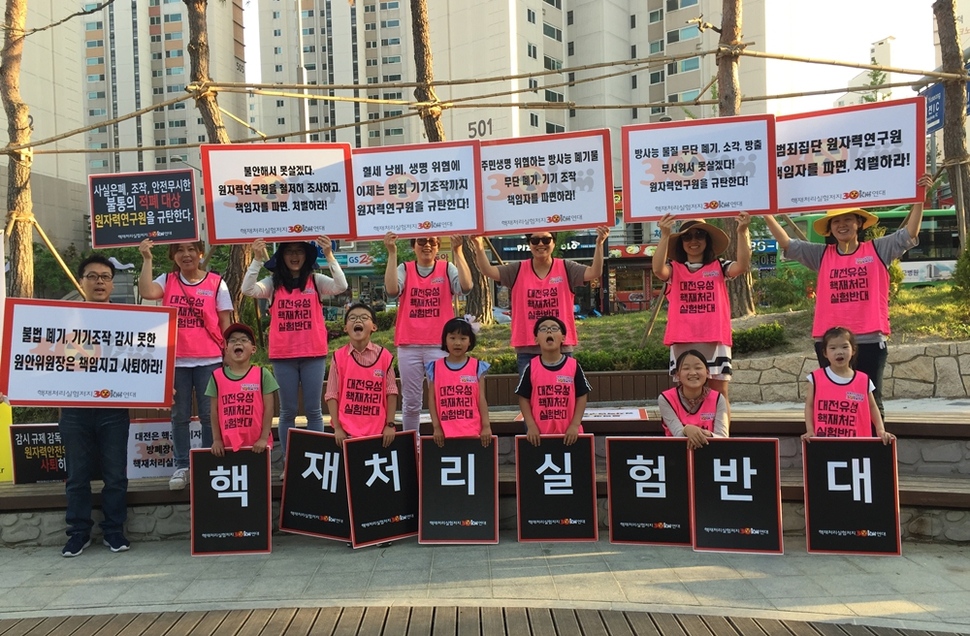 유성구 주민 김유라(46)씨도 마찬가지다. “사용후핵연료 재처리라는 게 플라스틱이나 종이 재활용하는 것처럼 환상적인 기술이라면 당연히 해야죠. 그런데, 다른 몇몇 나라에서도 안전성,경제성문제로 그만둔 사례들이 많아요. 고독성 핵종을 개별 포집하는 기기에 엄청난 비용을 투입해야 한대요. 100%포집도 아니구요. 대전에서는 실험만 하고, 상용화는 경주 쪽에 한다는데 님비처럼 우리만 안전하면 된다는 게 아니에요. 고준위방사성폐기물 관리방안도 없이, 우리 대전에서 거부하니 들여온 사용후핵연료봉을 다시 반출한다는 것은 지역 주민 사이에 갈등만 부추길 뿐이죠.” 2014년 이사 올 때만 해도 원자력연구원의 존재를 몰랐던 그는, 2015년 유성구 주민들의 ‘핵안전 주민조례 제정운동’ 등을 거치며 탈핵 운동가가 됐다. 지금은 생활협동조합 한살림 안에 설치된 핵없는세상생명위원회 위원으로 활동한다. 대전 시민사회단체들이 연대해 지난 3월 출범한 ‘핵재처리실험 저지 30km연대’ 활동에도 참여하고 있다.