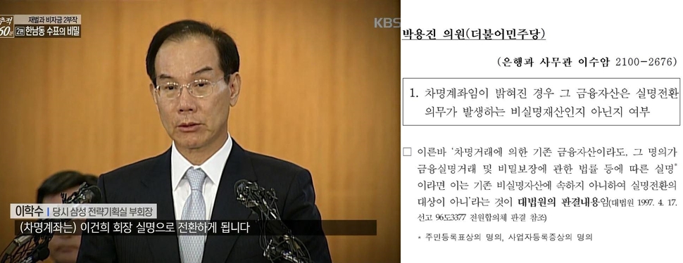 금융위에서 바로 답변을 보내왔다. “이른바 ‘차명거래에 의한 금융자산이라도, 명의가 금융실명거래 비밀보호에 관한 법률 등에 따른 실명이라면 이는 기존 비실명자산에 속하지 아니하여 실명전환의 대상이 아니’라는 것이 대법원의 판결 내용임.”(대법원 1997.4.17. 선고96 3377 전원합의체 판결 참조) 간단히 말해 ‘차명계좌도 실제 존재하는 누군가의 이름으로 된 실명자산이고, 따라서 실명전환 의무가 없다’는 설명이었다. 재벌이 차명으로 숨겨놓는 비자금 때문에 금융실명제를 실시했는데, 정작 차명계좌는 금융실명제 위반이 아니라는 황당한 답변이었다. 금융실명제법 유권해석 논란 금감원에서도 회신이 왔다. 은행을 관할하는 일반은행국에서는 ‘64개 계좌 중 1개가 실명전환되고 63개는 계약해지됐다’는 답변을 보내왔다. 증권을 담당하는 금융투자국에서는 957개 계좌 가운데 646개가 폐쇄됐고, 311개는 유지는 되고 있지만 잔고가 없거나(54개), 고객예탁금 이용료 등 소액이 입금돼 유지 중이라고 답했다. 결론적으로 명의자가 소유권을 주장한 은행 계좌 1개를 빼고 나머지는 전부 다 이 회장이 찾아갔다. 이는 ‘차명계좌는 실명전환 대상이 아니다’라는 금융위의 유권해석이 있었기에 가능한 일이었다. 9년 전 국민 앞에서 발표했던 “(차명계좌는) 이건희 회장 실명으로 전환하게 됩니다”라는 선언은 거짓말이었던 셈이다. 박 의원실은 금융위가 ‘차명계좌도 실명계좌’라는 유권해석의 논거로 제시한 1996년 대법원 판례와 차명계좌 관련 다른 판례들을 비교·분석했다. 박 의원은 그 결과를 갖고 지난 10월16일 금융위 국정감사 현장에서 삼성 차명계좌 문제를 제기했다. ‘이건희 삼성 회장이 차명계좌를 실명전환하지 않고, 그냥 인출해가 과징금과 고율의 세금을 피했다’는 내용의 이날치 <한겨레> 보도를 두고 박 의원과 최종구 금융위원장이 공방을 벌였다. “<금융실명제 종합편람>, 금융위에서 2008년에 펴낸 것 맞죠? 여기에 차명계좌는 실명전환해야 한다고 돼 있다. 실명전환 때 이자도 추가로 추징하도록 했다. 그런데 왜 (삼성은) 제대로 안 했나? 이명박 시절 금융위가 삼성 맞춤형 특혜를 제공한 것 아닌가? 왜 삼성 앞에만 서면 작아지나?”(박 의원) “그 지적에 동의할 수 없다. 삼성 앞에서 작아지고, 앞잡이 노릇 하고 그런 것 없다. 2008년 <금융실명제 종합편람>은 당시 배포도 안 했고, 적용도 중단했다. 현재 적용하는 것은 2009년에 내려진 대법원 최종 판단이다. 이에 따라 (금융실명제에 따른 차명계좌의 실명전환 의무 여부 등을) 해석·운영하고 있다.”(최 위원장) 국가기관의 유권해석은 공적 구속력이 있는 법령 또는 판례에 바탕을 둬야 한다. 그런데 금융위는 아무런 법적 구속력이 없는 대법원 판결의 보충의견을 근거로 ‘차명계좌는 실명전환 대상이 아니다’라는 유권해석을 내렸다. 차명계좌도 실명전환 대상이라고 적시한 1998년 대법원 판결을 금융실명제 업무편람에 수록해놓고도 현장에서는 이를 적용하지 않았다. 최 위원장은 “업무편람은 배포를 중단했다”며 2009년에 나온 또 다른 대법원 판례를 들고나와 유권해석의 정당성을 강변했다. 이건희 회장이 차명재산을 인출해간 2008년 이후에 나온 판결을 근거로 당시 유권해석의 정당성을 주장하는 것은 앞뒤가 맞지 않았다. 박 의원으로부터 ‘(나중에 나올 판결을 미리 알고 적용했다니) 금융위가 무당이냐?’는 핀잔을 듣게 된 이유다. 금융위에도 나름 ‘한방’이 있었다. 이날 오후 금융위 실무진이 박 의원을 찾아가 ‘삼성 차명계좌 1021개 가운데 1001개가 금융실명제 실시 이후에 만들어졌다’고 밝혔다. 1993년 8월 김영삼 대통령의 긴급재정경제명령에 따라 전격적으로 실시된 금융실명제는 당사자의 실명이 아닌 계좌는 두 달 이내에 실명전환하도록 하고, 이 기간을 넘기면 과징금과 고율의 세금을 부과하도록 했다. 금융실명제 실시 이후부터는 당사자 실명을 확인한 뒤에만 계좌를 개설해주도록 했다. 삼성 차명계좌들이 금융실명제 실시 이후에 개설됐다는 것은, 계좌들이 금융실명제에 따른 실명 확인을 거쳐 개설돼 법적으로는 ‘실명계좌’란 설명이었다. 실명전환 때 부과되는 과징금도 금융실명제 실시 당시 자산가액을 기준으로 매겨지기 때문에 금융실명제 실시 뒤 만들어진 계좌는 부과할 수가 없었다. 박 의원실은 ‘멘붕’에 빠졌다. 삼성 차명계좌 문제가 단순한 해프닝으로 끝날 수 있었다. 이대로 물러설 수는 없었다. 박 의원은 곧 새로운 문제점을 발견했다. ‘차명계좌들이 1993년 이후 만들어졌다면, 차명주식이 이병철 회장에게서 받은 상속재산이라는 특검 발표는 뭔가.’ ‘김용철 변호사는 자기도 모르는 계좌가 만들어졌다고 했는데, 이것도 (김 변호사의 실명을 확인한) 실명계좌란 말인가.’ 이날 박 의원은 삼성 차명계좌를 처음 세상에 알렸던 김 변호사와도 오랫동안 통화했다. 박 의원실 맹공에 두 손 든 금융위 박 의원은 이튿날(10월17일) 금감원 국정감사에서 김 변호사의 사례를 들어 삼성 특검 당시 “도명(이름을 훔친) 계좌를 적발한 적이 있느냐?”고 물었다. 민병현 
