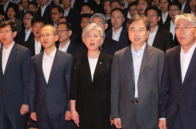 지난 6월19일 서울 외교부 청사에서 열린 취임식에서 애국가를 부르는 강경화 외교부 장관. 남성 관료들에게 에워싸인 강 장관의 모습이 인상적이다. 한겨레 신소영 기자