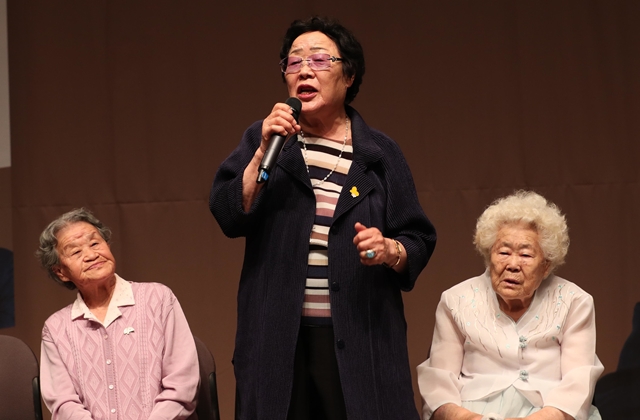 지난 6월8일 서울 중구 프레스센터에서 열린 기자회견에 참석한 박옥선·이용수·이옥선 할머니(왼쪽부터). 이날 일본군 ‘위안부’ 피해 할머니들은 “강경화 후보자가 외교부 장관이 돼 우리 문제를 꼭 해결해주겠다고 약속했다”고 말했다. 한겨레 강창광 기자
