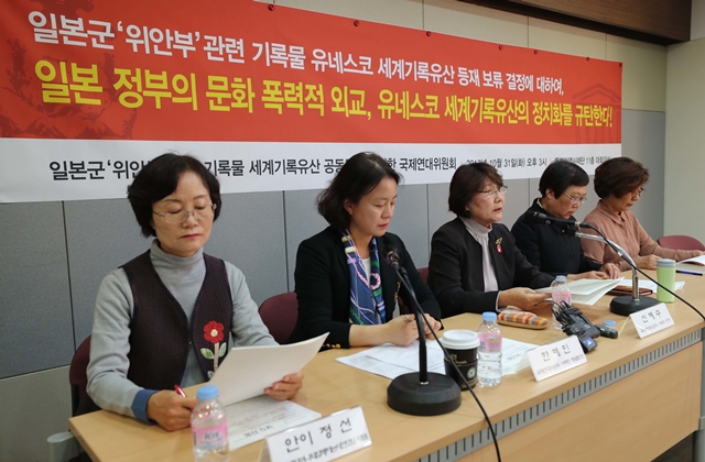 10월31일 오후 서울 서대문구 미근동 동북아역사재단 회의실에서 ‘일본군 위안부 기록물 유네스코 세계기록유산 등재 보류 결정’에 대한 국제연대위원회 사무단의 기자회견이 열렸다. 한겨레 백소아 기자