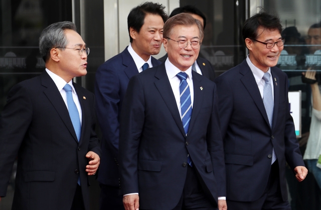 장하성 실장(맨 오른쪽)은 문재인 정부의 금융개혁을 이끌고 있다. 지난 6월12일 문재인 대통령이 국회 첫 시정연설을 마친 뒤 의사당을 나서고 있다. 한겨레 이정우 선임기자