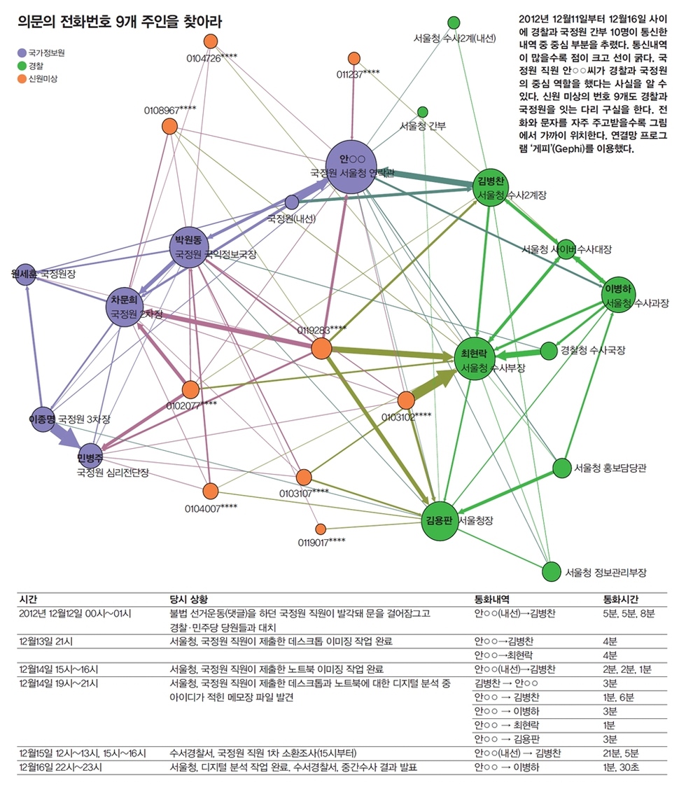 문자로 오고 간 구체적인 내용을 확인할 방법은 현재로서는 없다. 다만 누군가 9개 번호를 이용해 지속적으로 경찰과 국정원 간부들에게 상황을 ‘보고’하거나 거꾸로 ‘지휘’했을 가능성이 있다. 번호의 주인을 반드시 밝혀야 할 이유다. 통신기록만 놓고 봤을 때 경찰과 국정원을 연결하는 선은 하나가 아니다. 여러 선이 거미줄처럼 얽혀 있다. 국정원 대선 개입의 재수사는 이제 막 시작됐을 뿐이다.