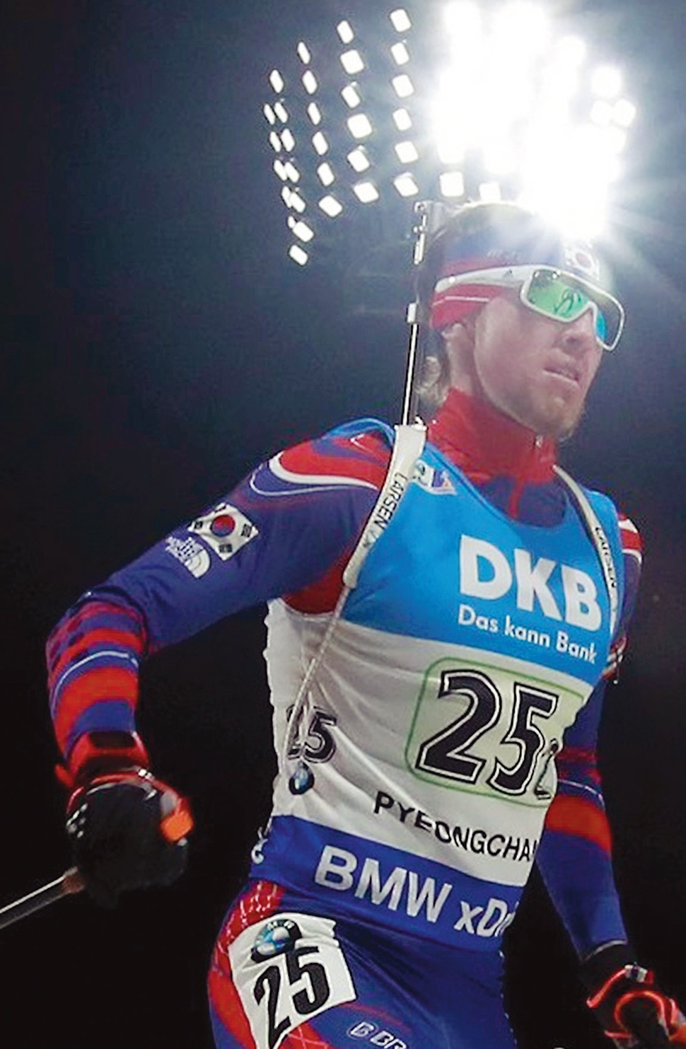 어른 키만 한 스키를 신은 육중한 체격의 사나이가 몸을 던져 설원에 누운 뒤 소총을 겨눈다. 이마로 흘러내린 금발을 뒤로 젖히고 과녁을 뚫어지게 쳐다보는 눈은 파란색이지만 유니폼 팔뚝엔 태극마크가 반짝 빛난다. 동방의 작은 나라에서 못다 이룬 꿈을 실현하기 위해 한국 국적을 취득한 러시아 출신 바이애슬론 귀화 선수 티모페이 랍신이다. 바이애슬론은 눈 위에서 스키를 타며 사격을 하는 스포츠다. 그는 요즘 설원을 가를 때 휘날리는 금발 헤어스타일만큼이나 뭇사람의 시선을 한 몸에 받고 있다.