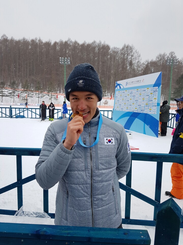 김마그너스가 2017년 12월20일 삿포로겨울아시안게임 크로스컨트리 1.4km 스프린트에서 우승을 차지한 뒤 금메달을 깨물고 있다. 연합뉴스