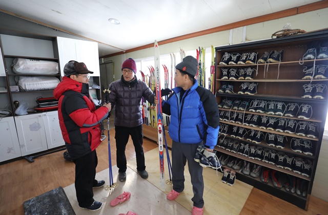 최원일 대관령체험학교 교장(가운데)이 크로스컨트리의 클래식 스키 장비를 나눠주고 있다. 크로스컨트리스키는 플레이트 폭이 좁고 길이가 짧으며, 신발도 운동화보다 조금 두꺼울 정도로 가볍다.