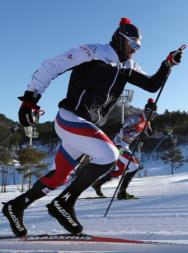 한국 크로스컨트리 스키의 유망주 김마그너스 선수가 2017년 12월2일 평창 알펜시아 크로스컨트리센터에서 코스 적응 훈련을 하고 있다. 알파인스키와 달리 스키화의 뒤축이 플레이트에서 떨어진 모습이 뚜렷이 보인다. 연합뉴스