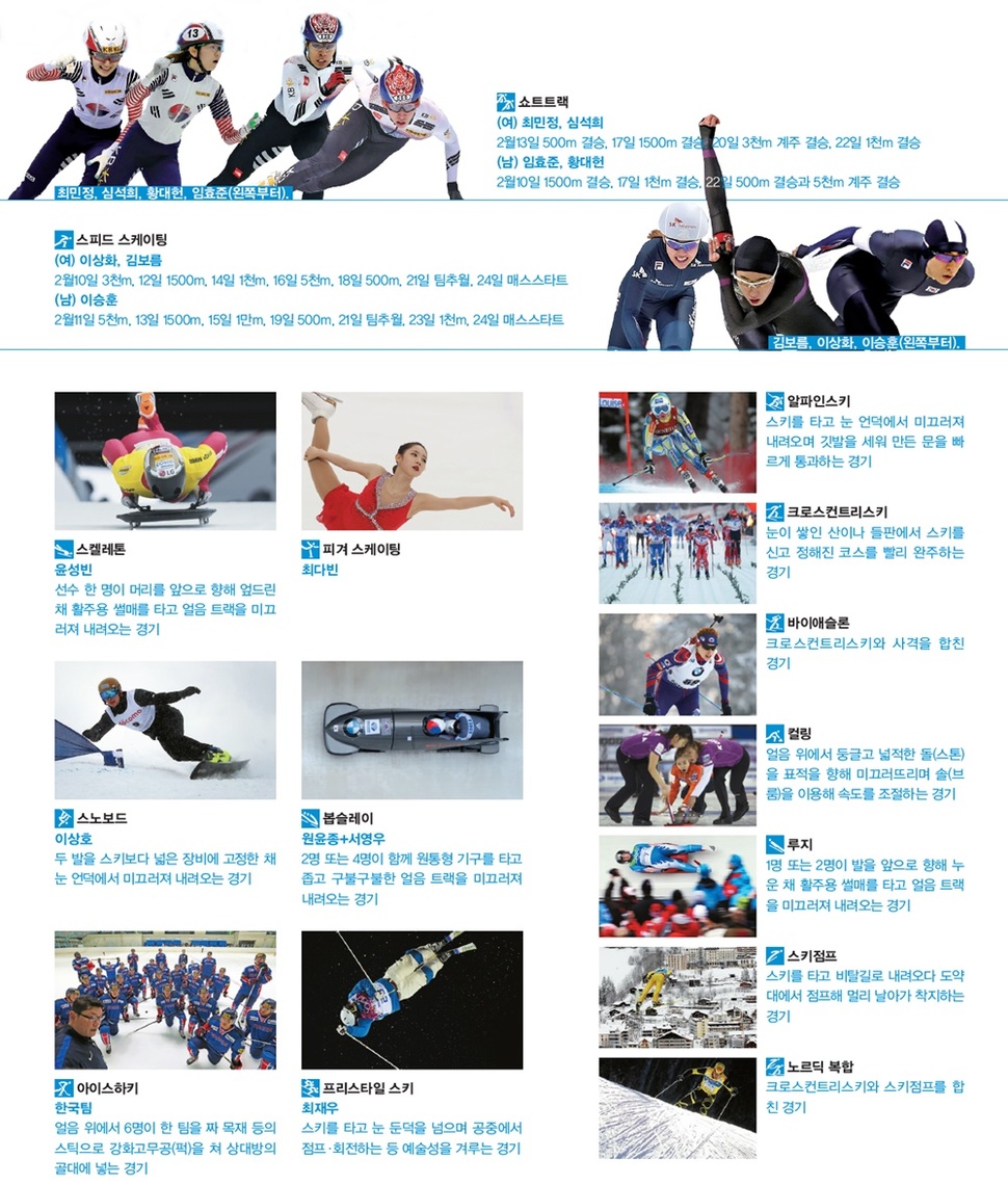 이번 대회는 역대 가장 많은 금메달(102개)이 걸렸고, 가장 많은 국가(예비등록 92개국)가 출전할 것으로 보인다. 국가 주도로 도핑 스캔들을 일으킨 러시아는 국제올림픽위원회(IOC)가 출전을 금지해 선수들이 개인 자격으로 참여한다. 한국은 전통적으로 쇼트트랙과 스피드스케이팅에서 메달을 거머쥐었는데 올해는 스켈레톤과 스노보드, 봅슬레이 등 다른 종목도 기대해봄직하다.
