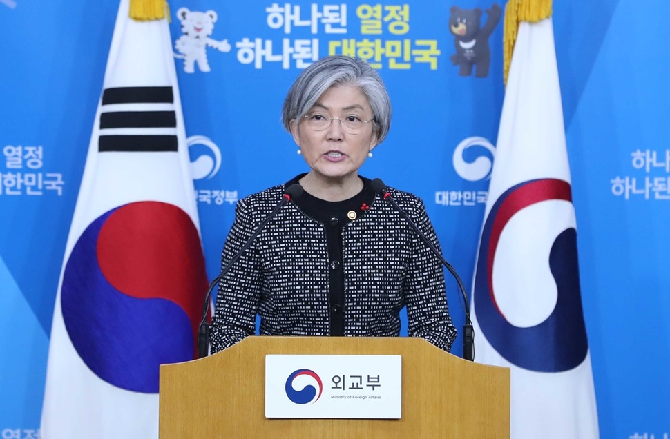 강경화 외교부 장관이 2017년 12월27일 오후 서울 종로구 정부서울청사에서 ‘한-일 일본군 위안부 피해자 문제 합의 검토 TF 보고서 발표와 관련해 모두 발언을 하고 있다. 사진공동취재단