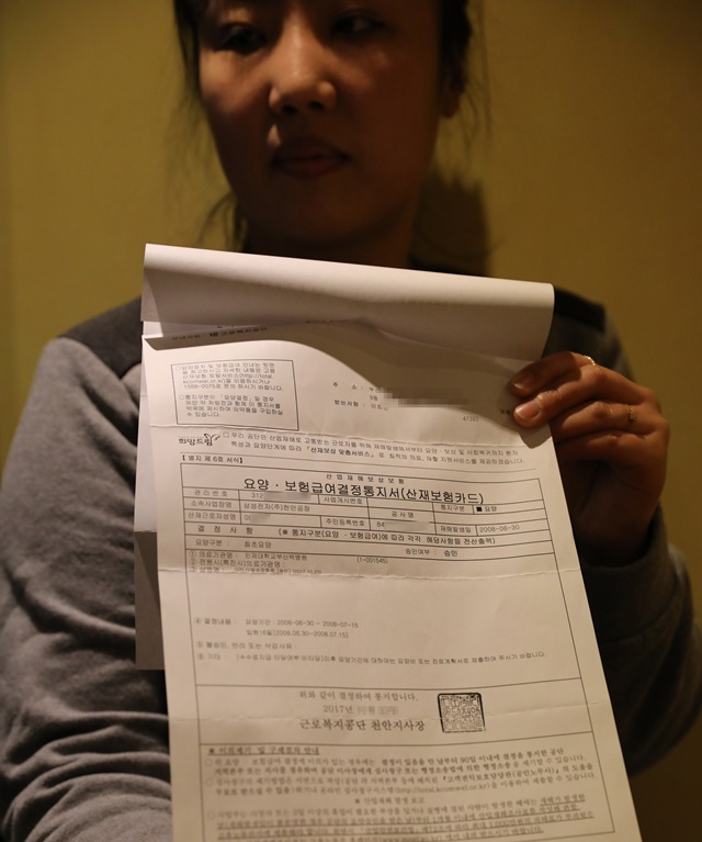 삼성전자 LCD 노동자 이희진씨가 2017년 12월14일 ‘산업재해 인정’을 뜻하는 근로복지공단 요양보험 급여 결정 통지서를 들고 있다. 대법원은 2017년 8월 29일 이희진씨에게 나타난 희귀병인 다발성경화증을 처음 산재로 인정하는 판결을 내놨다. 김진수 기자
