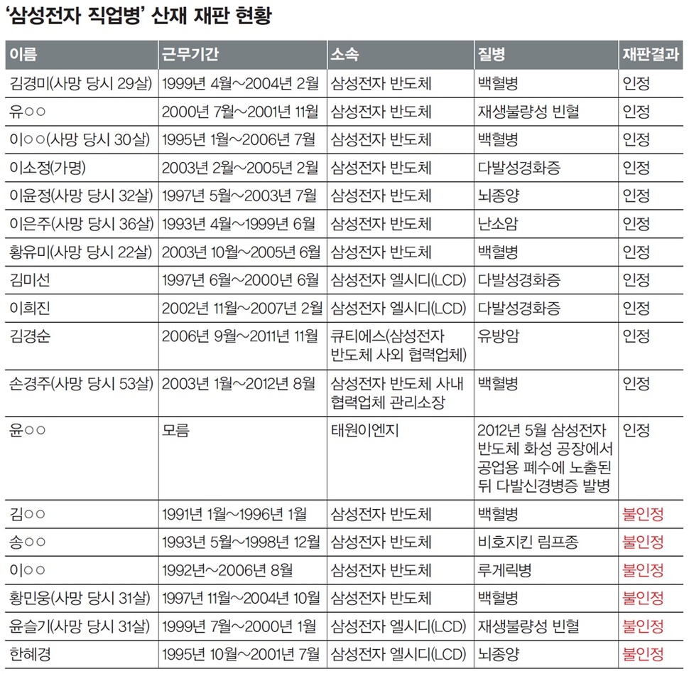 현재까지 소송을 제기한 노동자 27명 가운데 1심 재판이 진행 중인 9명을 제외하고 산재가 인정된 사람은 모두 12명이다. 고용 형태별로 보면, 정규직이 9명, 삼성반도체 사내·외 협력업체 노동자가 3명이었다. 병명 가운데는 백혈병이 4명으로 가장 많고, 다발성경화증 3명, 난소암·뇌종양·유방암·재생불량성빈혈·다발성신경병증 등이 각각 1명이었다.