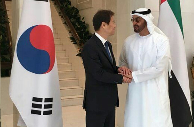 지난해 12월10일 아랍에미리트(UAE)를 방문한 임종석 대통령비서실장이 모하메드 빈 자이드 알나흐얀 UAE 왕세제와 만나 악수하고 있다. 청와대 제공