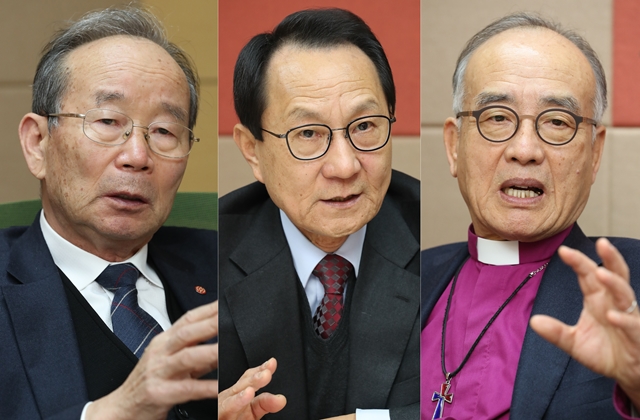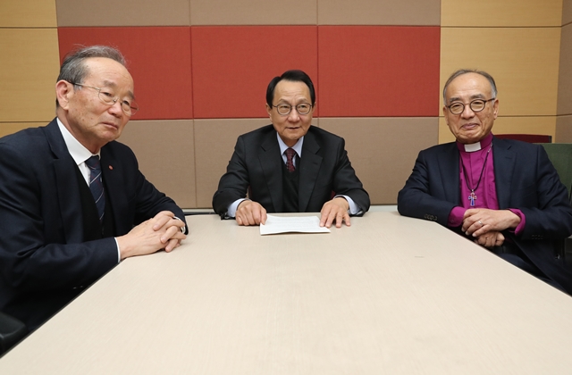왼쪽부터 박남수 전 천도교 교령, 박종화 경동교회 원로목사, 박경조 대한성공회 주교.