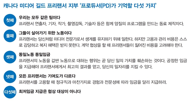 노조는 정규직 PD도 꾸준히 교육한다. 프리랜서 노동자들의 실질적 사용자인 PD에게 프리랜서 제작 스태프의 권리를 상기시키고 연대를 촉구하기 위해서다. 노조는 ‘프리랜서의 공정한 채용과 대우를 위한 가이드라인’을 만들었는데, 이 중 ‘PD가 기억할 다섯 가지’에 핵심이 들어 있다. ‘동일노동 동일임금’ ‘최저임금은 협상 대상이 아니다’ 등이다(표 참조). 방송사 내 프리랜서 비중이 43.3%(한국전파진흥협회 2016년 자료)에 이르는 한국 방송 환경에도 시사하는 바가 크다.