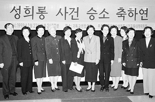 서울대 자연대 신 교수 성희롱 사건은 1990년대 여성운동에 한 획을 그었다. 1998년 2월 대법원이 성희롱을 인정하지 않은 2심 판결을 파기환송한 뒤 열린 승소 축하연 모습. 맨 왼쪽에 당시 피해자를 변호했던 박원순 서울시장이 보인다. 한겨레 자료사진