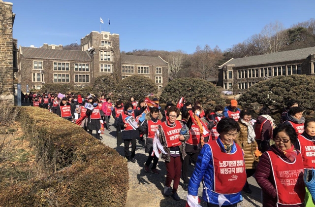 2월21일 오후 서울 서대문구 연세대 청소·경비노동자들이 집회를 열기 위해 학생회관 쪽으로 이동하고있다. 이날 본관 건물 뒤 연희관에선 한국 사회의 불평등 구조를 논하는 지식인들의 심포지엄이 열렸다.