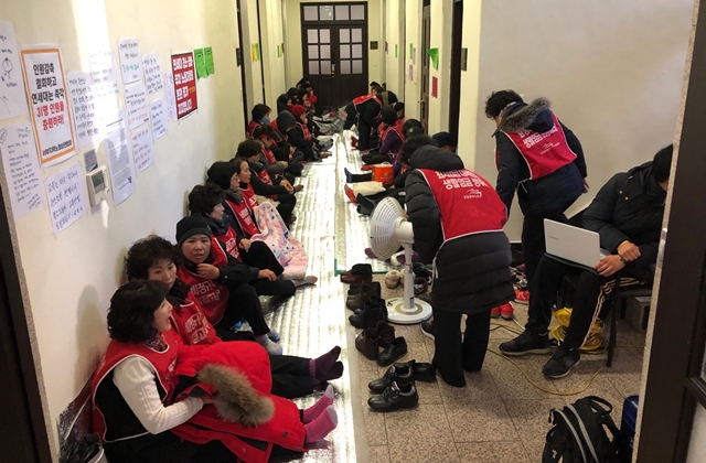 2월21일 오후, 연세대 청소·경비노동자들이 본관에서 농성을 이어가고 있다.