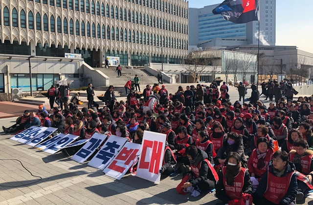 2월21일 오후, 연세대 청소·경비노동자들이 학생회관 앞에서 학교 쪽에 구조조정 철회를 요구하며 집회를 열고 있다.
