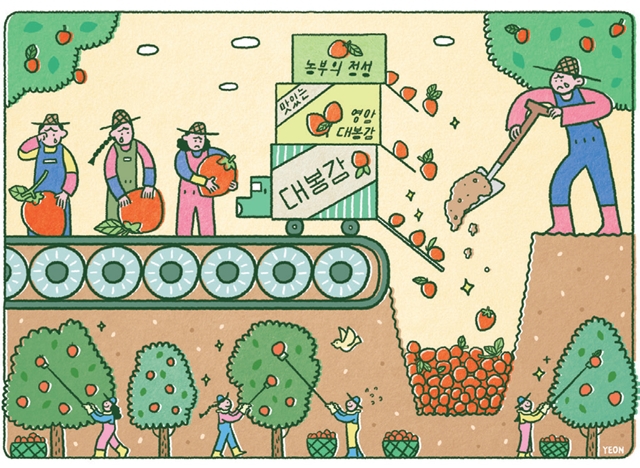 오늘은 감 이야기를 해볼까? 단감·땡감·반시·홍시…. 감에도 여러 종류가 있어. 오늘 이야기할 건 대봉감이야. 주로 완전히 익기 전에 따놓고, 맛있게 익혀서 먹어. 달고 큼직해서 하나만 먹어도 배가 부르고, 여럿이 나눠 먹기도 해. 그런데 지난해 가을과 이번 겨울, 전남 영암군에서는 농부들이 대봉감을 차로 실어다가 상자째 버렸어. 버리기만 한 게 아니라 경운기로 짓이겨버리기도 했어. 어떤 농부는 땅을 파서 아예 묻어버리고. 영암군은 지난해 생산한 감 중 무려 810t을 폐기하기로 했대. 10kg 상자로 따지면, 8만 상자가 넘는 양이란다. 과수원에 감이 많이 달리면 풍년이잖아. 그럼 모두 꽹과리를 치고 노래를 부르며 얼싸안고 좋아해야 마땅하지 않아? 그런데 왜 버렸을까? 이유를 쉽게 말하면, 감을 시장에 내놓고 팔아서야. 옛날처럼 가족이나 친지·이웃·친구들끼리 서로 나눠 먹는다면, 풍년이 들수록 모든 사람이 노래를 부르며 기뻐했을걸. 지금은 감 같은 농산물도 공장에서 만든 물건처럼 상품으로 취급해. 시장에 같은 상품이 많이 나오면 가격이 낮아지거든. 반대로 물건이 귀하면 가격은 올라가고. 이게 시장과 가격의 기본 법칙이야. 이를 두고 영국의 경제학자 애덤 스미스는 1776년 책 <국부론>에서 시장의 ‘보이지 않는 손’이 움직여 자원 배분을 가장 효율적으로 해준다고 했어. 그런데 이번 감 농사의 경우는 이 말이 잘 들어맞지 않았던 거 같아. 처음엔 풍년으로 감 가격이 낮더라도 사람들이 많이 사면 감이 귀해져 다시 가격이 올라가야 하잖아. 그런데 애초에 시장에 내다 팔 의욕조차 생기지 않을 정도로 감이 쌌던 거야. 가격이 터무니없이 낮아서 감을 따는 인건비나 운반비도 나오지 않으니, 어떡해? 팔면 팔수록 오히려 손해가 더 커지는데! 그래서 농민들과 정부는 감을 많이 내다 버려야 적당한 가격을 받을 수 있다고 생각했어. 이걸 어려운 말로 ‘시장격리조치’라고 해. 감을 시장에서 떼어놓는다는 뜻이야. 예전 같으면 이웃끼리 나눠 먹고 잔치를 벌였을 텐데, 시장격리조치랍시고 내다 버리고 땅에 파묻는 상황이라니, 이건 애덤 스미스가 기대한 자원의 효율적 배분이 아니라 오히려 자원 낭비야. 물론 영암군에서 모든 감을 내다 버린 건 아냐. 감말랭이로 만들어 팔거나 감을 사 먹기 어려운 이웃에게 선물로 보낸다고 해. 삼촌은 농산물을 일반 공산품처럼 다루면 안 된다고 봐. 사람은 배고프면 음식을 먹어야 해. 공산품이 없으면 조금 불편해도 살 수 있지만, 농산물이 없으면 아예 살기가 어려워. 그래서 공산품은 시장가격에 맡겨도, 농산물은 그러면 안 된다고 생각해. 농민이 생산한 좋은 농산물은 나라가 다 사는 새로운 방식을 궁리해보면 어떨까? 물론 정부와 농민, 시민이 머리를 맞대 대화와 토론으로 정해야겠지.