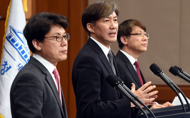 청와대 조국 민정수석(가운데)이 3월20일 오전 청와대 춘추관 대브리핑실에서 문재인 대통령이 발의할 개헌안을 설명하고 있다. 왼쪽은 진성준 정무기획비서관, 오른쪽은 김형연 법무비서관. 청와대사진기자단