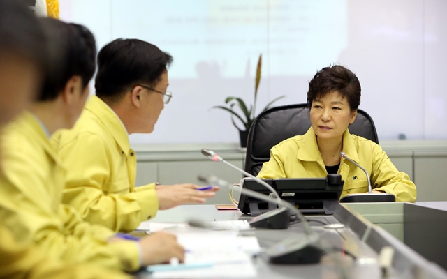 박근혜 전 대통령이 2014년 4월16일 오후 5시15분께 중앙재난안전대책본부를 찾아 보고받고 있다. 청와대사진기자단
