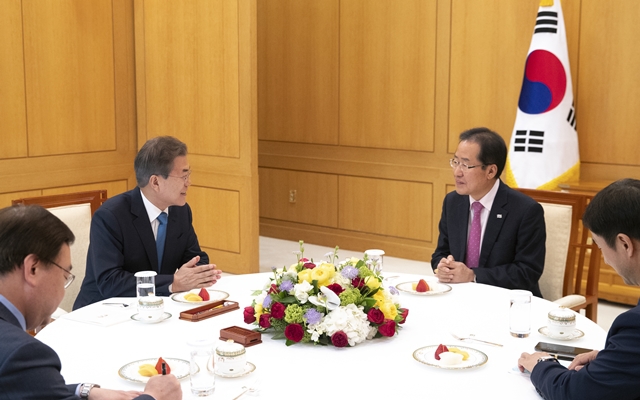 남북 정상회담 등 외교·안보 현안에 집중했으며, 홍 대표가 제기한 국내 정치 현안에 대해 문 대통령은 주로 경청했다”고 설명했다.