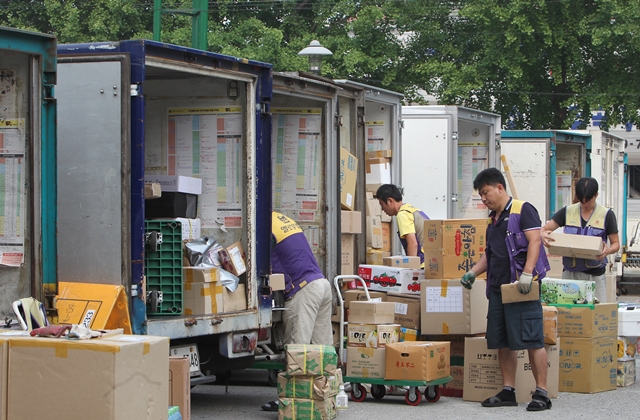 차량에 배송물품을 싣는 택배기사들. 한겨레 신소영 기자