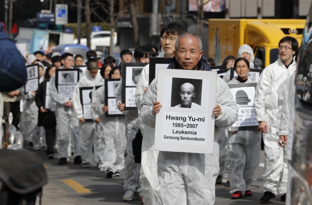 삼성전자 반도체 공장에서 일하다 백혈병으로 숨지면서 반도체 공정의 직업병 논란을 세상에 처음 알린 고 황유미씨의 11주기인 3월6일 오후, 고 황유미씨와 삼성 산재사망 노동자 추모의 날 행진하고 있다. 맨 앞은 고 황유미씨의 아버지 황상기씨. 한겨레 이정아 기자 삼성전자 반도체 공장에서 일하다 백혈병으로 숨지면