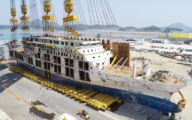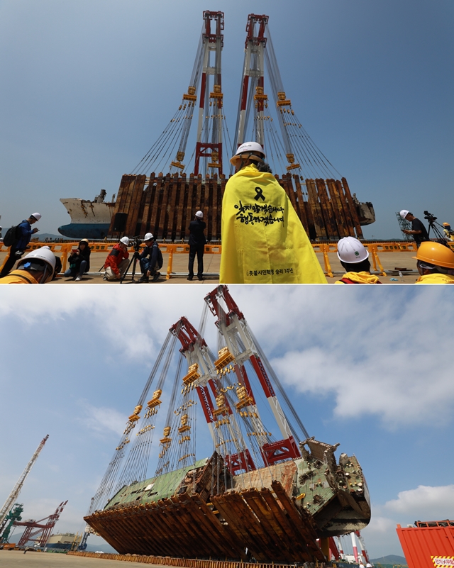 5월10일 전남 목포신항에서 세월호가 참사 이후 처음 바로 섰다. 공동취재사진