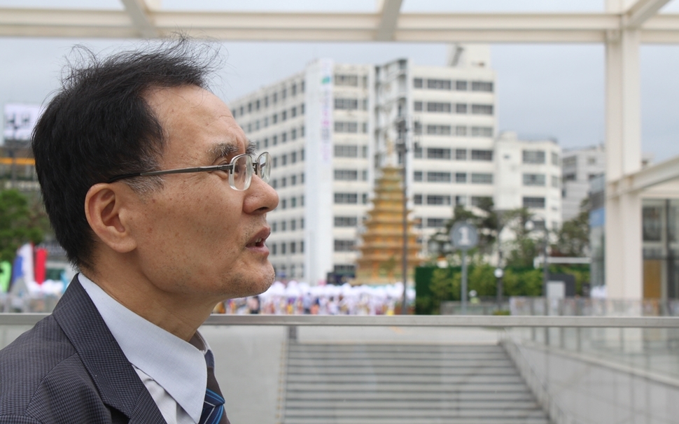 벽체는 헐리고 쇠기둥만 남은 옛 전남도청 별관 뒤쪽에 선 안길정씨가 윤상원 열사의 죽음을 이야기 하고 있다. 5·18 당시의 헬기 총격 흔적이 남아 있다는 전일빌딩이 멀리 보인다. 김현대 선임기자