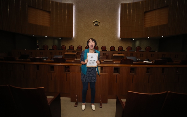 김승하 KTX열차승무지부장이 5월29일 서울 서초구 대법원청사 내 대법정을 기습 점거한 뒤 양승태 전 대법원장의 구속 수사와 김명수 대법원장의 면담을 요구하고 있다. 한겨레 백소아 기자