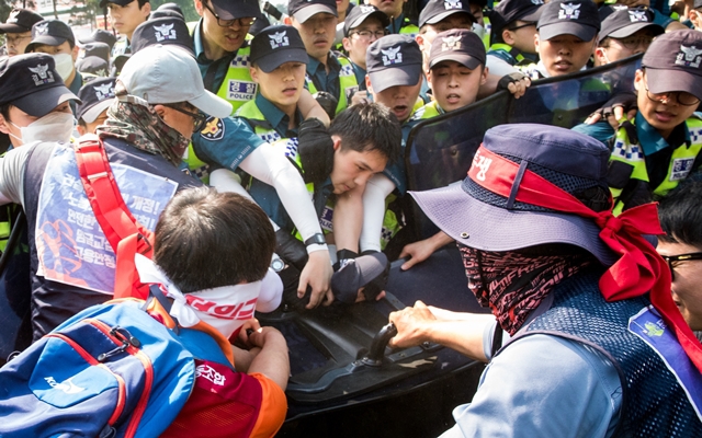 5월28일 오후 서울 여의도 국회 앞에서 열린 ‘최저임금 개악저지 민주노총 수도권 총파업대회’에 참가한 노동자들이 국회로 향하다 이를 막아선 경찰과 몸싸움을 벌이고 있다. 한겨레21 박승화